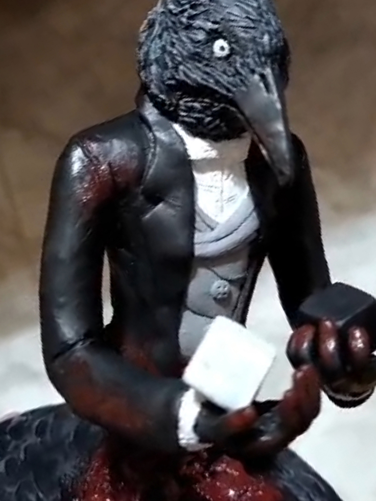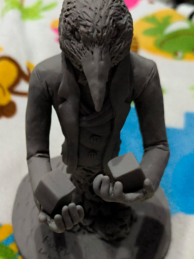 Con herramientas de modelado fina y punzones, esculpí detalles como las plumas estilizadas del traje, la textura del pico y los pliegues del abrigo. El rostro una mezcla de humanoide y cuervo fue tratado con especial cuidado para mantener ese equilibrio entre lo realista y lo surreal.