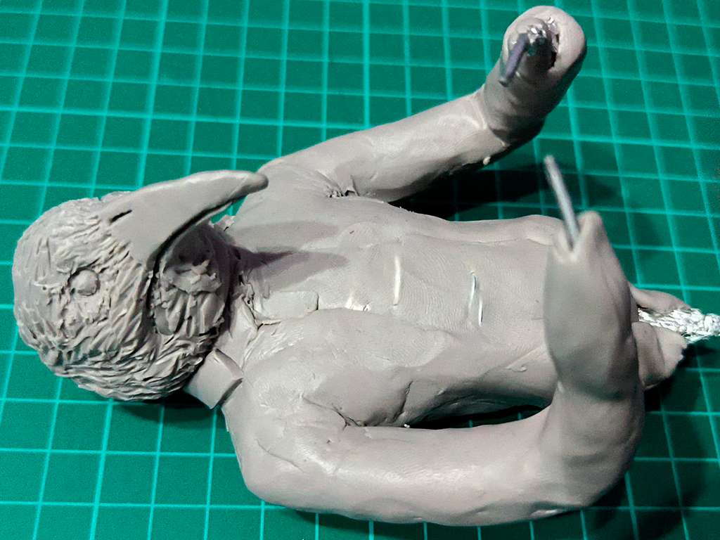 El proceso comenzó con una estructura básica en alambre fino, que actúa como esqueleto interno para dar estabilidad y soporte a la figura. A partir de ahí, fui aplicando capas de arcilla polimérica (Sculpey), moldeando primero los volúmenes generales: el cuerpo, el pico, la cabeza y las alas plegadas. Presté especial atención a las proporciones sobrias y angulosas que definen el carácter frío y controlado de Mr. Crow.